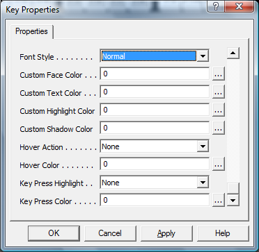 These are the font characteristics that define a Font per key - it is recommended you use the "..." button to use the Font dialog to easily select the font you wish, which will fill in these values - please be aware font support on the Run-Time target may be limited - see Fonts.