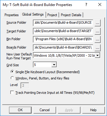 Target Folder - Location of Target files for all Panels. Any Builds will be created here under the name of the Project (Panel), then the Target System subfolder. A "Test" set of files (Windows Win32 platform) will be location in the Project (Panel) folder, so you can view the Build results immediately (Build | Execute).