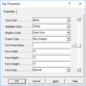 These are the font characteristics that define a Font per key - it is recommended you use the "..." button to use the Font dialog to easily select the font you wish, which will fill in these values - please be aware font support on the Run-Time target may be limited - see Fonts.