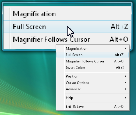 The Magnifier provides 2 menu modes. There is a special Magnifier Menu (which uses your whole screen for the menuing and uses very large text), and the standard Windows menu system. This chapter provides a reference for the full screen Magnifier Menu.