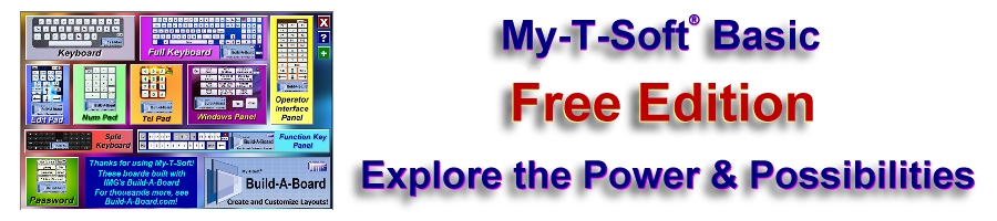 My-T-Soft® BasicVirtual Keyboards, Button Panels & Key Padsfor Mobile, Rugged, Tablet, and Touch screen Computer SystemsMy-T-Soft® Basic is the Windows run-time component of IMG's Build-A-Board, which supports custom virtual on-sreen keyboards, keypanels and keypads. My-T-Soft Basic provides the program to display and operate these keyboards. When unlicensed, the Free Edition includes