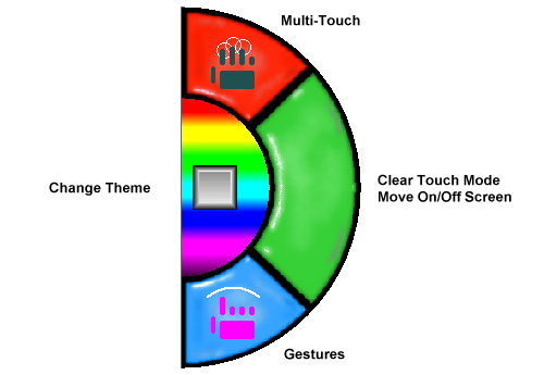 The large Green touch area will clear (turn off) the current touch mode (Multi-Touch or Gestures) and operate in the normal mode (Note: Flicks are supported in normal mode). If the current mode is currently "normal" (no Multi-Touch or Gestures), then a touch will move My-T-Soft TS off-screen. When off-screen, a touch will bring My-T-Soft TS back onscreen.