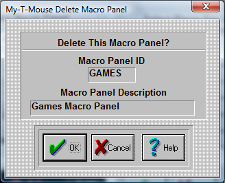 Use with extreme caution. Once the panel is deleted, it cannot be recovered! Press the OK Button to Delete the Selected Macro Panel. If you do not want to delete your panel, press the CANCEL button. |