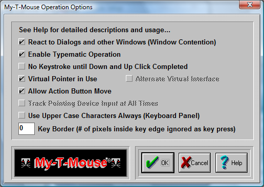 IMPORTANT NOTE: There are various settings here to change how My-T-Mouse operates. If you are having problems typing, see Interface Settings.