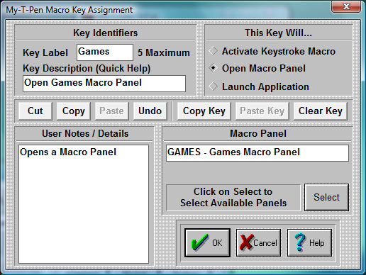 These shortcut keys may be used to manipulate & operate within My-T-Pen Setup / Macro Key Editing. For example, you could Copy Key information from an existing panel to be pasted into another Macro Panel.