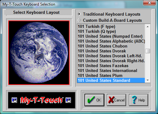 My-T-Touch can operate with many different keyboard layouts. By selecting the same keyboard layout that Windows uses, you can synchronize the display on My-T-Touch with the characters generated in your application.