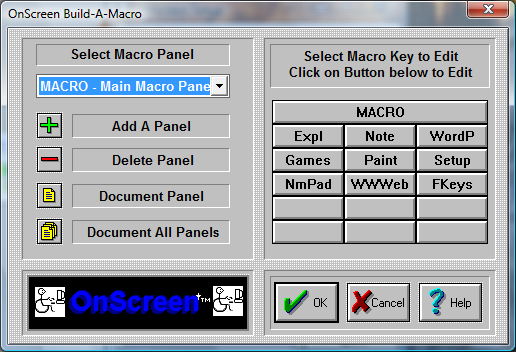 Advanced Notes: The panels included have been setup with various options to help illustrate the functions available. They may be changed or deleted as you desire. When running OnScreen, clicking the top panel of the Main Macro panel will open OnScreen Setup and go directly to Build-A-Macro. This is useful for fast macro panel / button changes. Macro Panels may be nested up to ten levels. Clicking on the top button of a nested panel will return to the previous panel, which is a shortcut for advanced users. In general, it is better to use a button to indicate the panel to open.