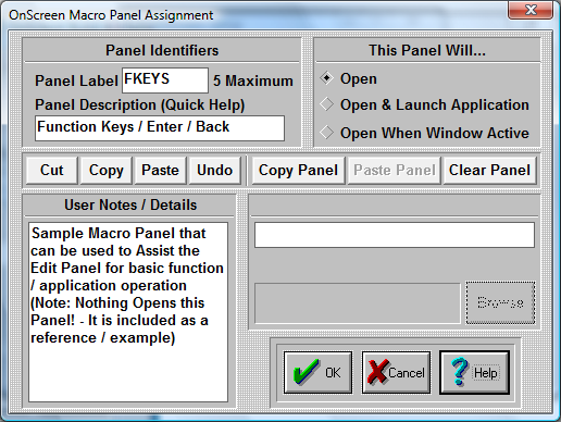 Click on this Radio-Button if you want to assign an application to this Macro Panel. Enter the application name and path in the edit box below (Application), or press Browse to select an application. You may also enter a Working Directory that will become the current directory when the Application is launched. When accessed, the panel will open & then automatically launch the application.