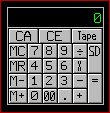 The calculator is a standard four function calculator. To operate simply press the desired number, press an operation key, press the next number, and press an operation key or the total (=) key. You may then send the displayed number to the active window by pressing the SD (Send) button. While there is a number stored in memory, the calculator's display window frame will change color to indicate that memory has a value stored.
