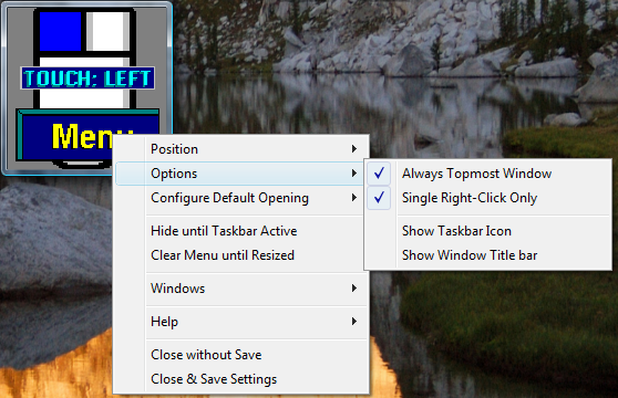 This toggles whether TouchRight Utilities is always topmost (always visible above other windows) or not. A Check Mark in the menu indicates that the Topmost setting is active. For best results, it is recommended that the Topmost setting be On.