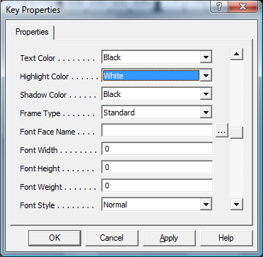These are the font characteristics that define a Font per key - it is recommended you use the "..." button to use the Font dialog to easily select the font you wish, which will fill in these values - please be aware font support on the Run-Time target may be limited - see Fonts.