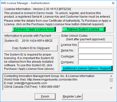 For proper operation, the IMG Standard Download as a self-extracting installation executable should be used. Program files must reside in the \Program Files (or \Program Files (x86) location for 64-bit) for correct operation in Windows (security/user-interface requirements in Windows 10).