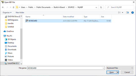 The KEYBOARD.KBF is the default layout - if you want an existing layout to be default, copy your desired layout to the Build-A-Board/BOARDS/KEYBOARD.KBF file. The following example uses FunctionKNF.KBF as the desired default layout.