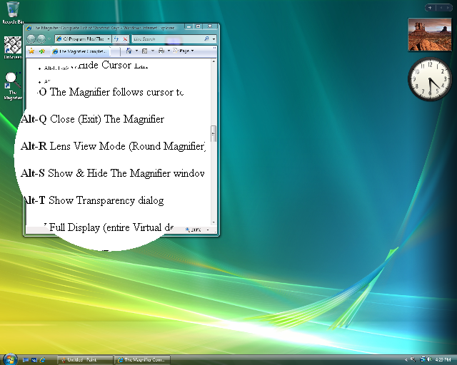Lens View Mode This option transforms The Magnifier window into a circle (lens view). You can also toggle this mode with the keyboard shortcut Alt-R. The circle size is controlled by the shortest size (height or width) when going into lens view mode. When returning to normal, the window will always appear square (based on the circle size). For larger or smaller circles, you must size The Magnifier window prior to changing modes. The memory mnemonic for Alt-R is "Go to a Round Lens (window)"