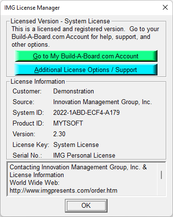 When properly Licensed with an IMG Personal License, a screen similar to this will show the License Information for the product. This display indicates that the software is Licensed. For help, support, and other options, you can click on the "Go to My Build-A-Board.com Account" to open a browser and access your account online.
