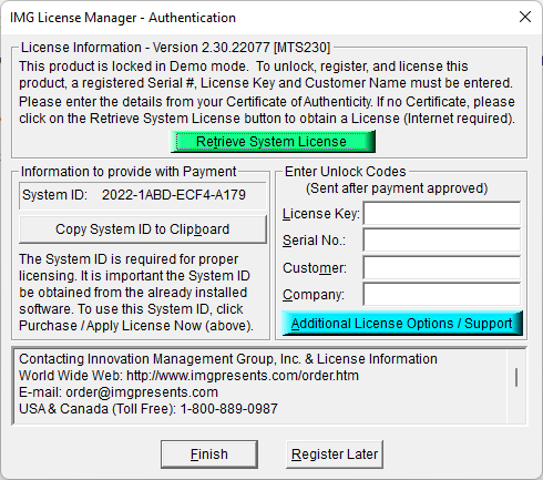 The IMG License Manager will operate with an IMG Personal License (Basic/Standard/Professional). This is a system based license that can license any supported IMG product per platform. Licensing is done through the internet and your Build-A-Board.com account, accessed via the "Retrieve System License" button.
