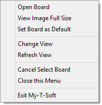 The Select Board window (if available via the Popup Menu or via button with the CMD:BOARDS internal command) shows a view of all available Boards in the [Public Documents]\Build-A-Board\BOARDS folder. To select a board, just click on the board when highlighted - the Select Board window will close and the selected board will open. If available, a right-click will open an option menu (see below). You may scroll to the top, move up a row, or move up a page by using buttons at the top, or scroll to the bottom, move down a row, or move down a page by using buttons at the bottom. You may close My-T-Soft Basic using the X at the upper right.