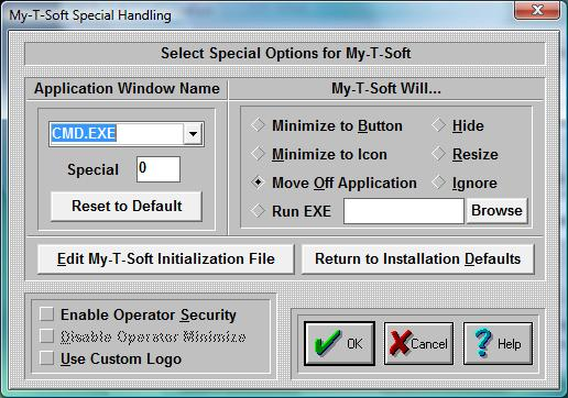 The ability to Run an Executable file adds great flexibility, and should be used in conjunction with the My-T-Soft TS Developers Kit. The executable file is run once until another executable is launched via My-T-Soft TS (typically when some other window becomes active that is in the Special Handling list). Primarily this is meant to be used to position or reconfigure My-T-Soft TS as different windows become active (different web pages, different applications, etc.). My-T-Soft TS only checks the Active window when it is open normally (NOT as an Icon or Button). Also, the React to Dialog and other Windows in Operation Options can override these settings.