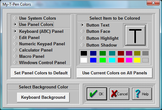 Select "Use Panel Colors" to use My-T-Pen Colors. My-T-Pen colors allows you to customize My-T-Pen by coloring each panel's keys and buttons.