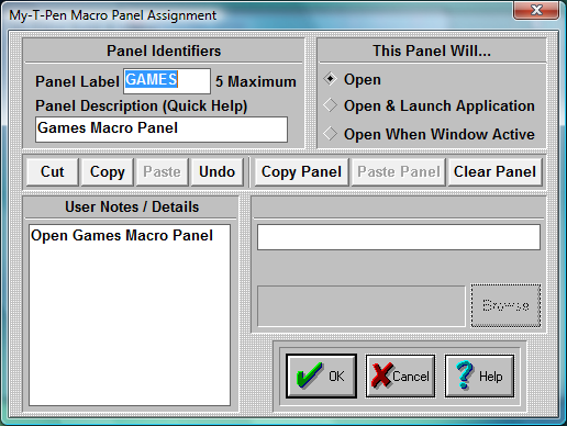 When you click on the top button of a Macro Panel in My-T-Pen Setup, you may edit the Panel settings for the current Macro Panel.