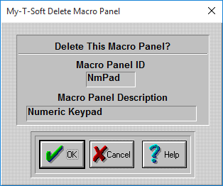 Use with extreme caution. Once the panel is deleted, it cannot be recovered! Press the OK Button to Delete the Selected Macro Panel. If you do not want to delete your panel, press the CANCEL button. |