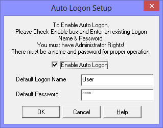 Check Enable Auto Logon On to enable the automatic logon of the Default User / Default Password combination. You must enter a valid User Name along with the proper Password to ensure proper operation of the Automatic Logon.
