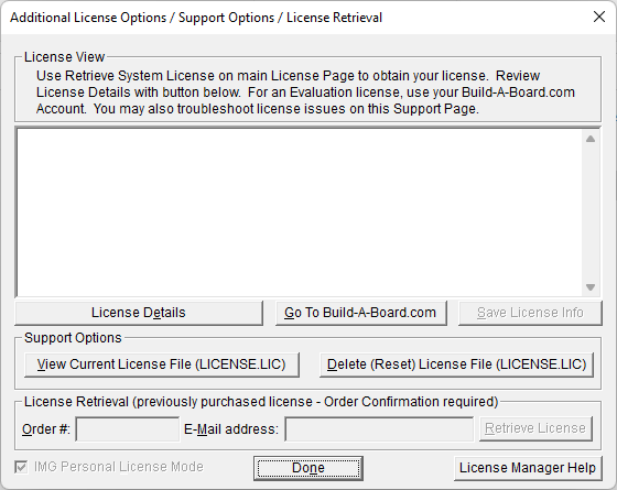 The IMG License Manager will operate with an IMG Personal License (Basic/Standard/Professional). This is a system based license that can license any supported IMG product per platform. Licensing is done through the internet and your Build-A-Board.com account, accessed via the "Retrieve System License" button.