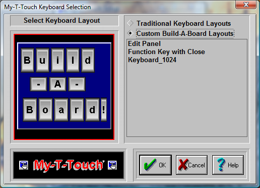 There are a few sample, custom Build-A-Board Layouts available. Additional Build-A-Board layouts can be created, and when placed in the Installation Folder will be added to this list. When selected, the KEYBOARD.KBF in the users configuration folder is replaced with the selected layout. When My-T-Touch is run, the layout is recognized, and the Build-A-Board compatible run-time (MYTSOFT2.EXE) is used to operate with the version 2.x keyboard layouts.