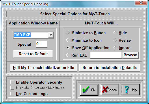 The ability to Run an Executable file adds great flexibility, and should be used in conjunction with the My-T-Touch Developers Kit. The executable file is run once until another executable is launched via My-T-Touch (typically when some other window becomes active that is in the Special Handling list). Primarily this is meant to be used to position or reconfigure My-T-Touch as different windows become active (different web pages, different applications, etc.). My-T-Touch only checks the Active window when it is open normally (NOT as an Icon or Button). Also, the React to Dialog and other Windows in Operation Options can override these settings.