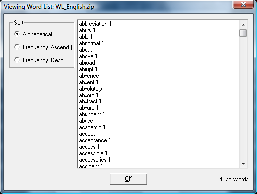 You can double-click on a word list to view, or select a word list, and click on this button. When viewing a word list from the Word List Assistant, you can sort the list alphabetically, by frequency (either ascending or descending). When frequency sorted, the list shows the internal representation (numbers) used to properly sort the list.