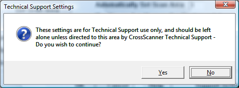 If you select the Support Settings button from the CrossScanner Setup (Advanced) dialog, you will see a warning outlining the fact that the settings are only to be used when directed by CrossScanner Technical Support Staff. If you have been directed by CrossScanner Technical Support Staff, select Yes to continue. Otherwise, select No.