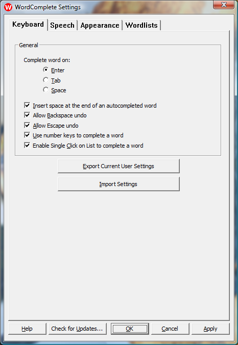 Apply - This will accept and apply all changes made and update WordComplete without closing the Settings pages